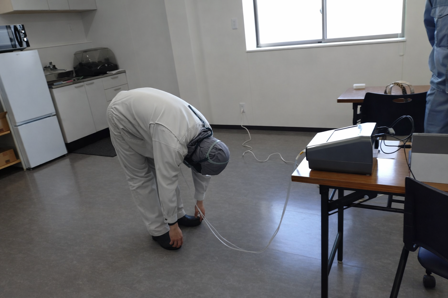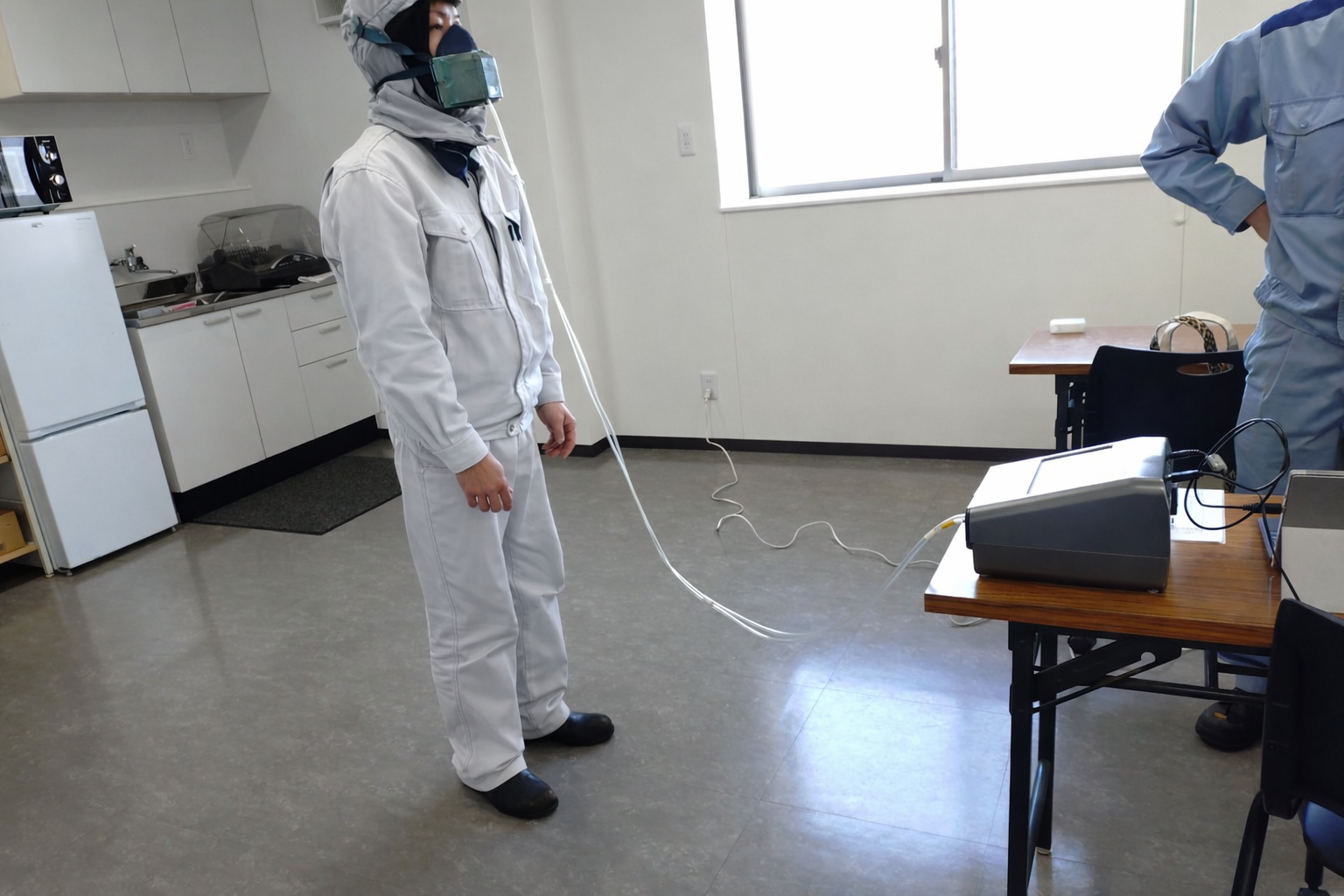 JFE西日本ジーエス株式会社さんに来ていただいて、顔にしっかりマスクが装着されているかどうかを測定器を使用して確認していただきました。